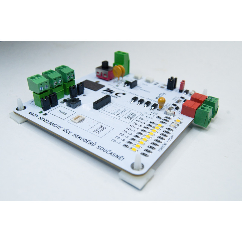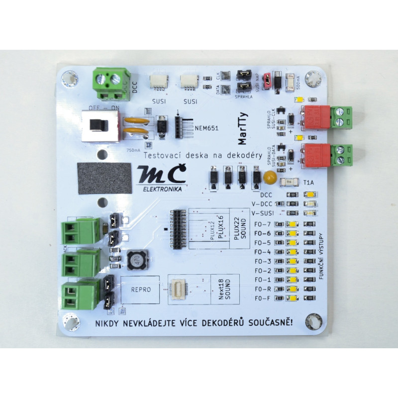 Nová deska pro testování dekodérů určená pro všechny, kteří si chtějí jednak vyzkoušet různá nastavení CV registrů u DCC dekodérů a nechtějí neustále rozebírat svoje modely. Deska umožňuje nahrávání FW pomocí PC rozhraní Zimo MXULFA, stejně jako zvuků do dekodéru. Implementována jsou celkem tři rozhraní pro dekodéry a Next18, Plux12/16/22 a také NEM651. Samozřejmě je možné připojit i drátový dekodér za pomoci dodávané redukce, která je součástí balení.