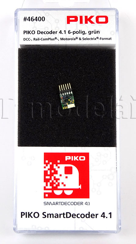 PIKO SmartDecoder 4.1 je univerzální digitální dekodér nejnovější generace se světelnými výstupy a 0,8ampérovým výstupem pro motor. PIKO SmartDecoder 4.1 ovládá datové formáty DCC s Rail-ComPlus®, Motorola® a Selectrix® a lze jej také použít v analogových systémech. Dekodér automaticky rozpozná příslušný provozní režim.