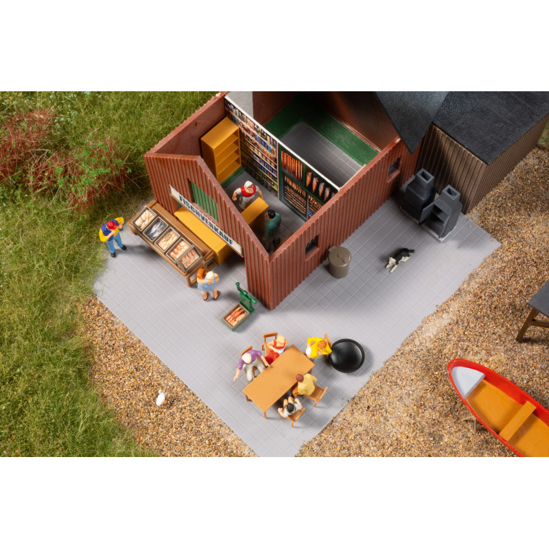 V menší dřevěné přístavbě s přístavkem se nachází prodejna ryb, která se hodí k výrobkům č. 11 474 a 11 476. Prodejna je vybavena pulty, regály, stojany a váhou a díky dvěma udírnám nabízí také ochutnávku přímo na místě. K tomuto účelu je k dispozici posezení. Stavebnici doplňují další dekorace včetně dalšího zboží k prodeji, přenosného ohniště a popelnic.