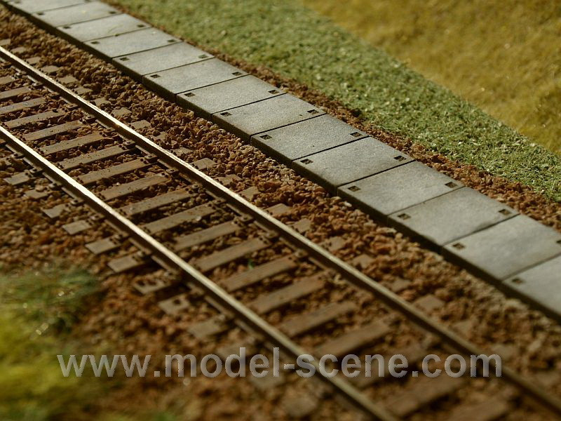 Betonové panely jsou vyráběny technologií laserování z tvrdého kartonu a jejich povrchová úprava je provedena včetně probarvení a finální patiny. V případě panelů pro nástupiště nejsou znázorněna kovová oka, nýbrž stejně jako ve skutečnosti je v otvorech s oky znázorněno zasypání jemným štěrkem.