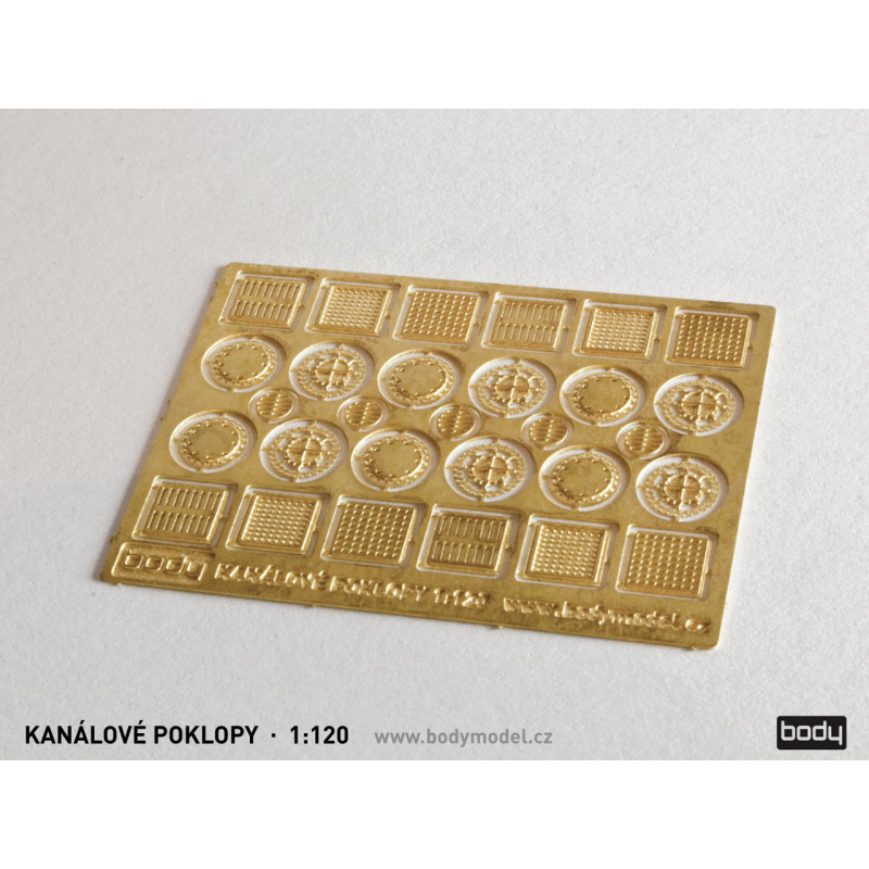 29 kanálových poklopů vyleptaných z mosazného plechu tloušťky 0,3 mm.