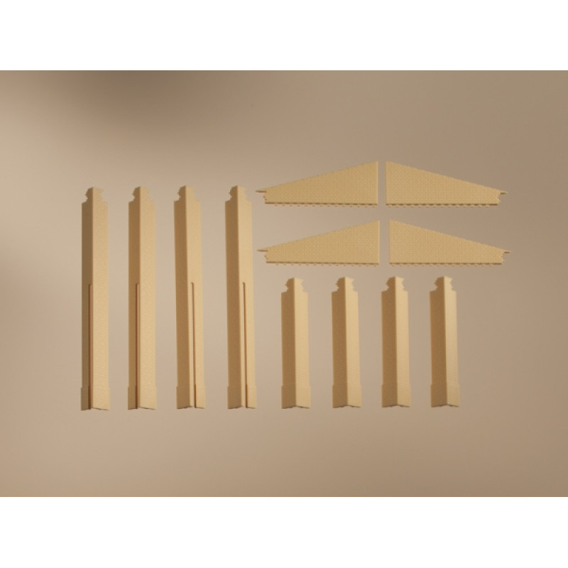 2 levé a 2 pravé štíty: 48 x 19 mm 2 levé a 2 pravé rohové sloupy s drážkou: 8 x 8 x 51 mm 2 levé a 2 pravé rohové sloupy krátké: 8 x 8 x 51 mm