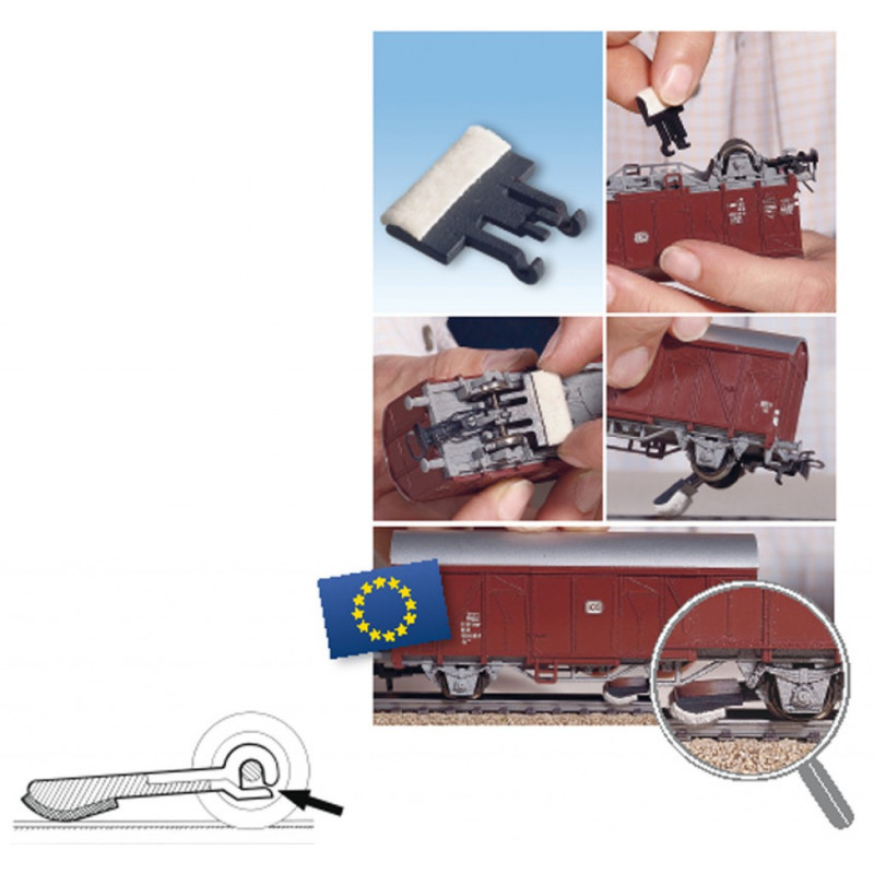 Kartáčky k čištění kolejnic od nečistot. Jsou určeny k nacvaknutí na nápravy vozů TT. Balení obsahuje 5 kusů.