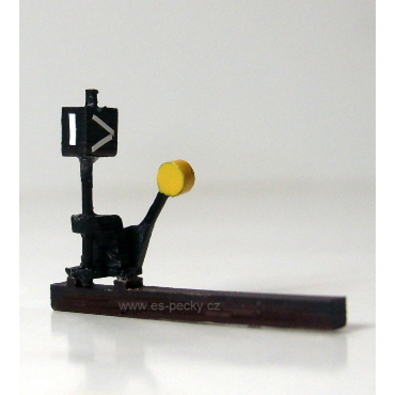 Nefunkční, ale velmi povedená maketa mechanického výhybkového návěstidla pro jednoduchou výhybku (bez přestavníku). Závažím je žlutě označeno, neboť se jedná o dálkově stavěnou výměnu.