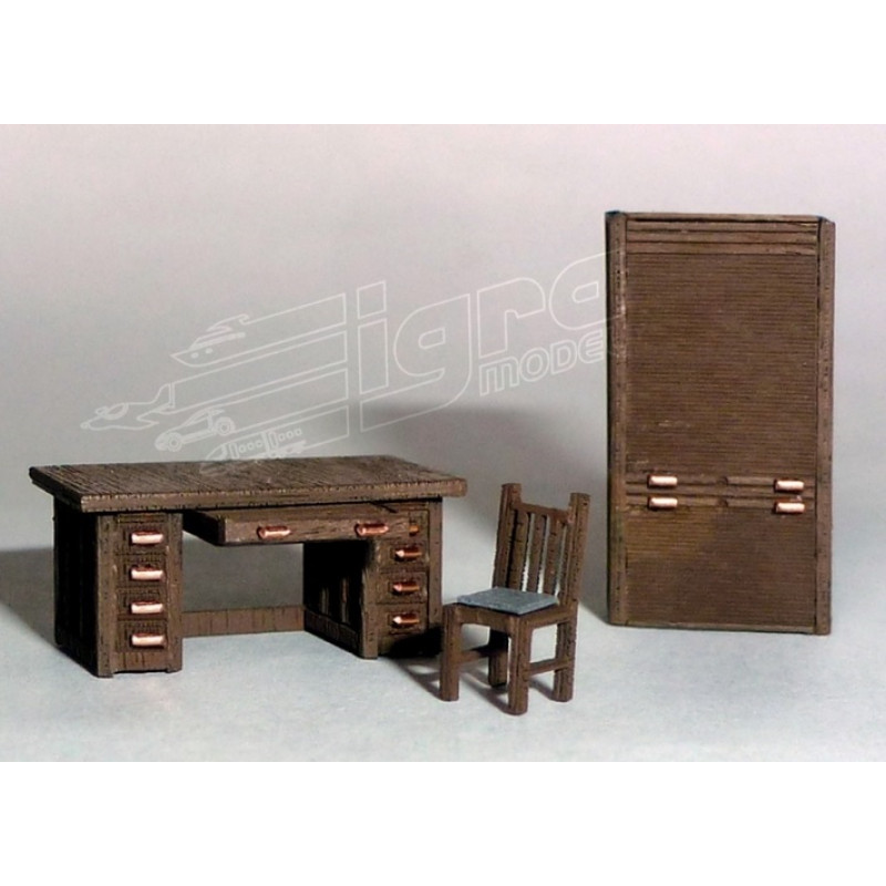 Nábytek - stavebnice obsahuje díly ke kompletaci zobrazených dílů: 2x skříň, 2x pracovní stůl a 2x židle.