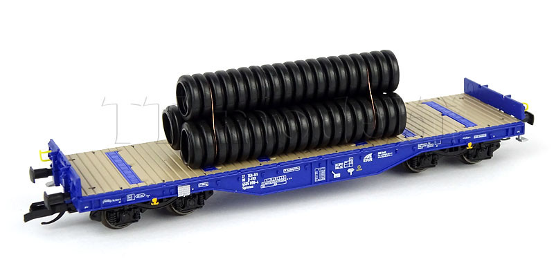 Náklad plastového odpadního potrubí průměru 900mm, 1 svazek obsahuje 3 kusy trubek, upnuté k sobě. Rozměr 1 svazku 50 x 20 x 19 mm . Pasuje do vozů Eas, Es, Res TT atd. Možné použít i pro H0 (bude představovat menší verzi nákladu). Na výběr více variant (kusy a délky). Náklad je především z plastu, je tedy lehký a nelze použít jako závaží na vůz.