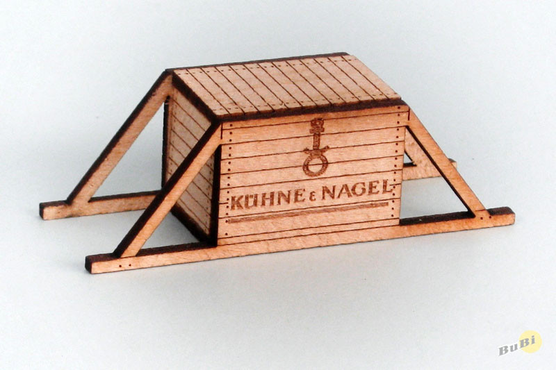 Hotový model dřevěné přepravní bedny s nápisem ,,Kühne & Nagel". Vhodné pro 2osé i 4osé vozy.