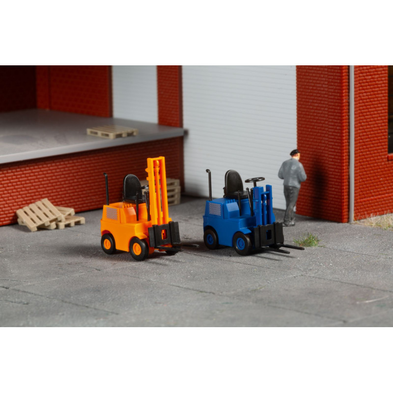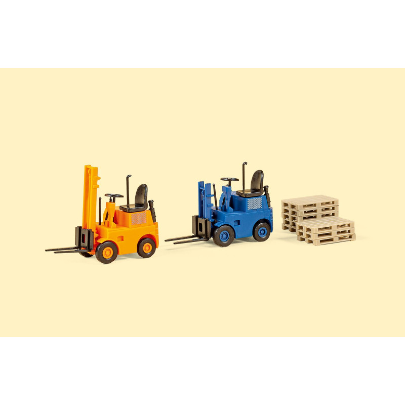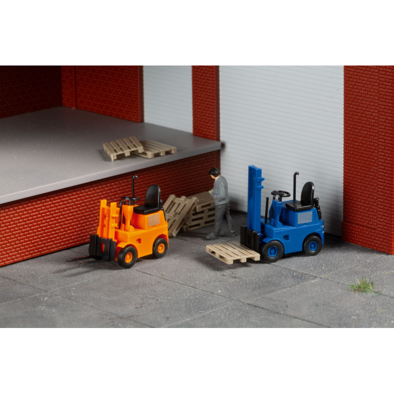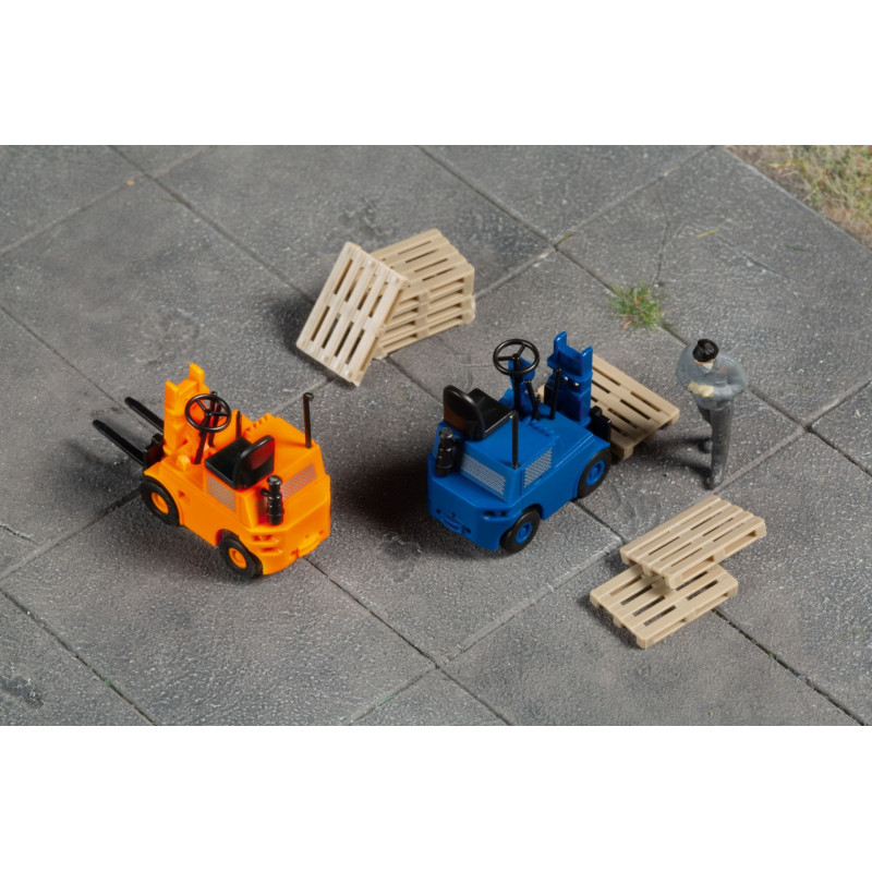 Rozměry: vysokozdvižné vozíky 23 x 9 x 14/18 mm, 8 palet 10 x 7 x 1 mm.