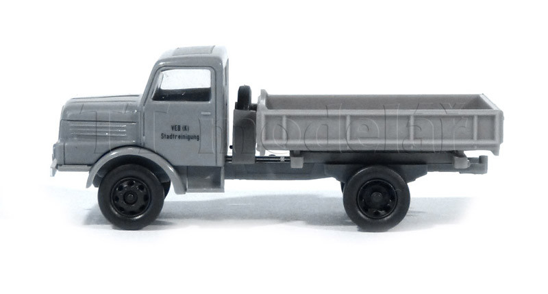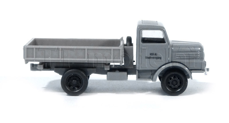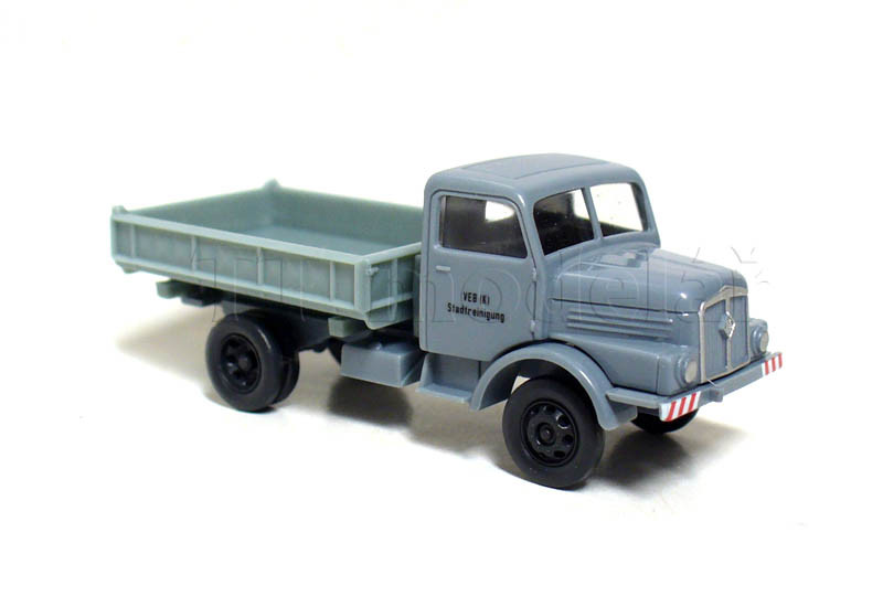 Model nákladního auta H3A Sachsenring sklopka. V šedé barvě a s popisem VEB Stadtreinigug - čištění města.