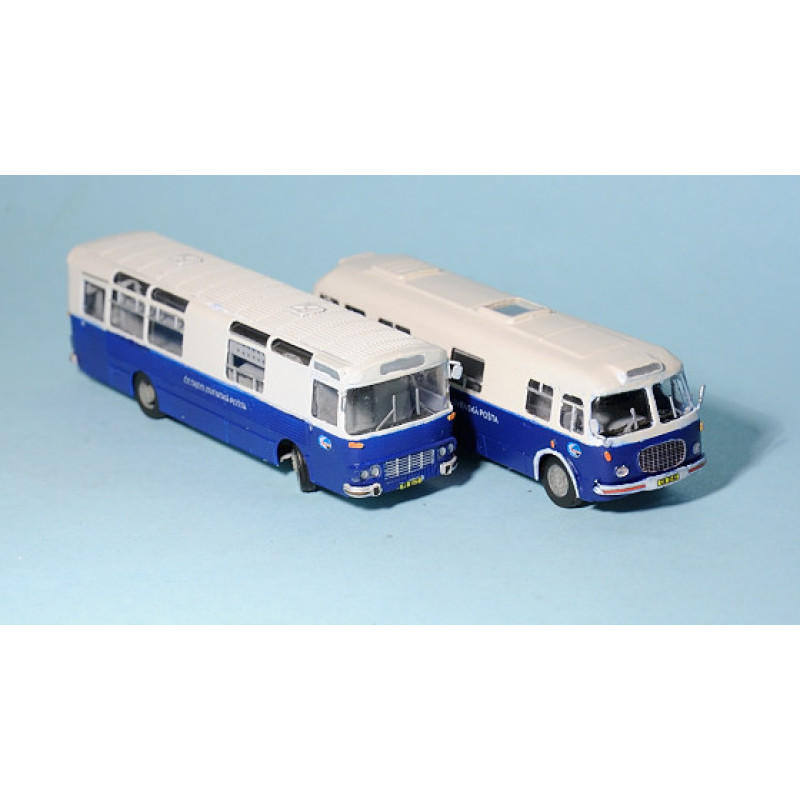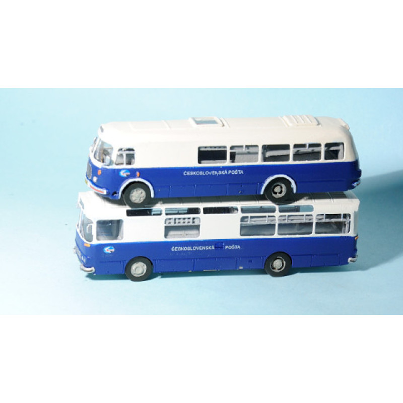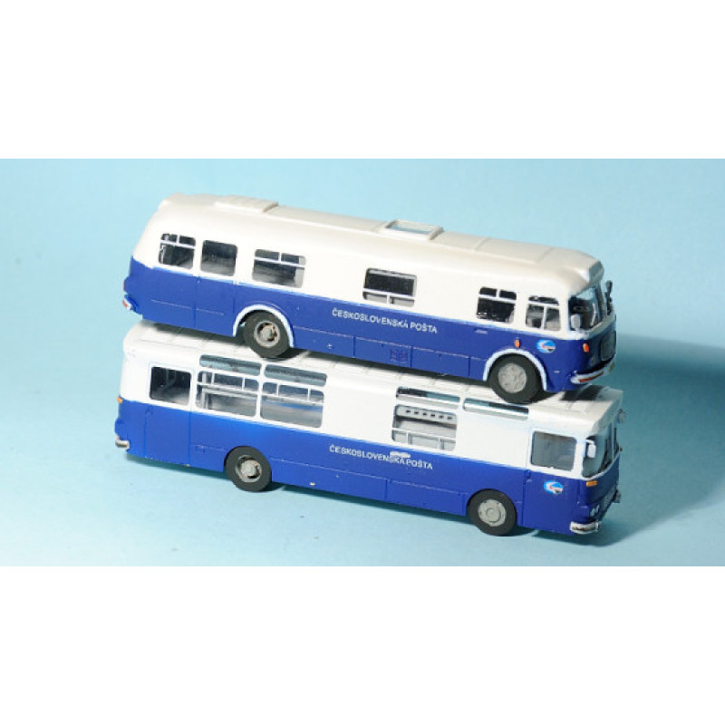 Zvýhodněná sada 2 ks stavebnic autobusů v provedení ambulantní pošty – 1x Škoda 706 RTO a 1x ŠL11. Obsahují obtisky bílých popisů pro provedení „Československá pošta“ s logem SPOJE, určené pro starší polomáčené tmavě modré provedení skříně. Obtisky jsou vyrobeny bílým tiskem na čirém papíře na tiskárně ALPS.