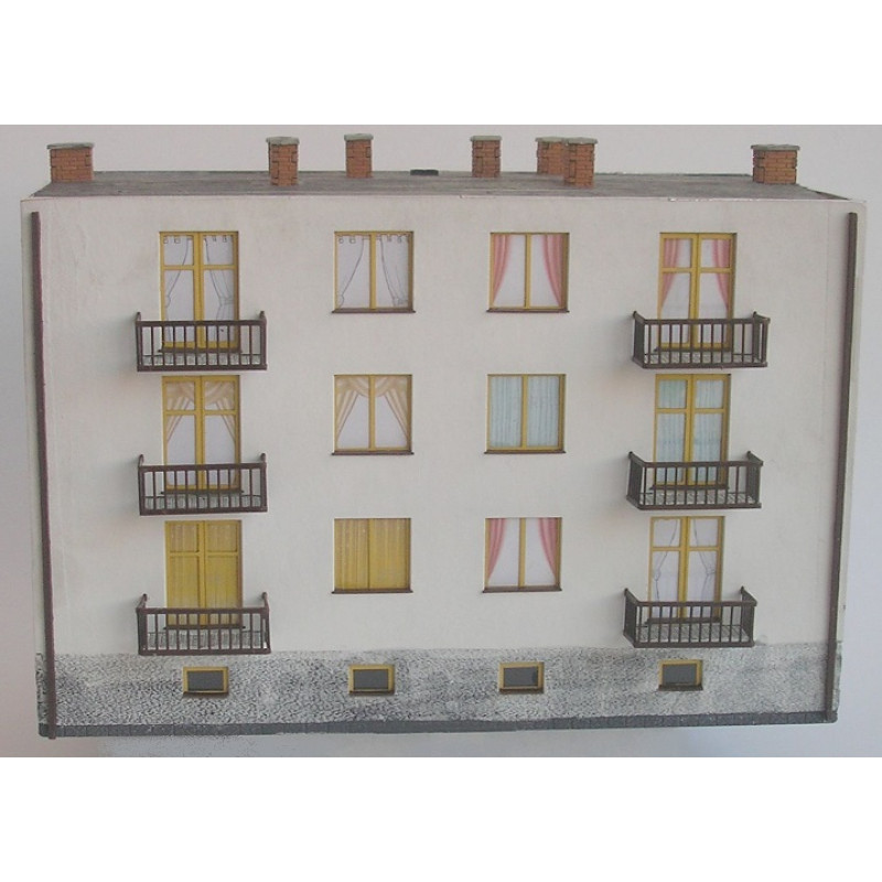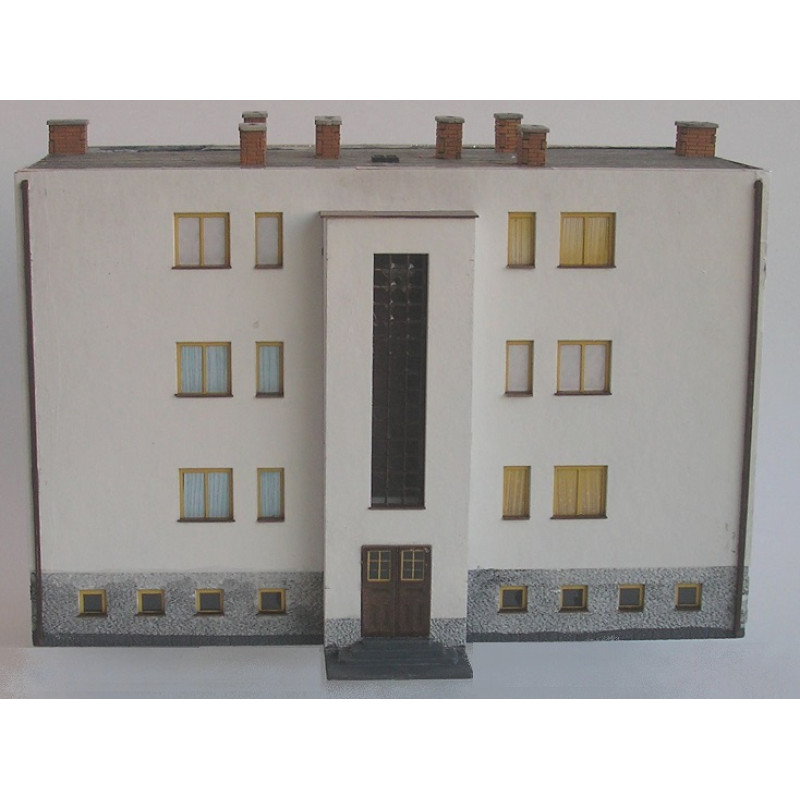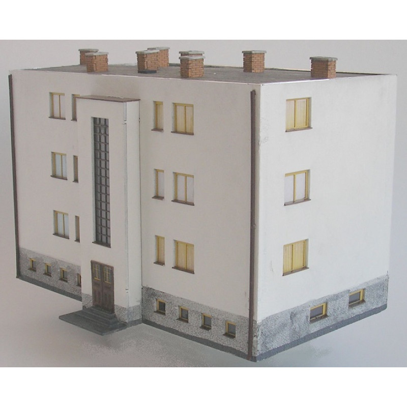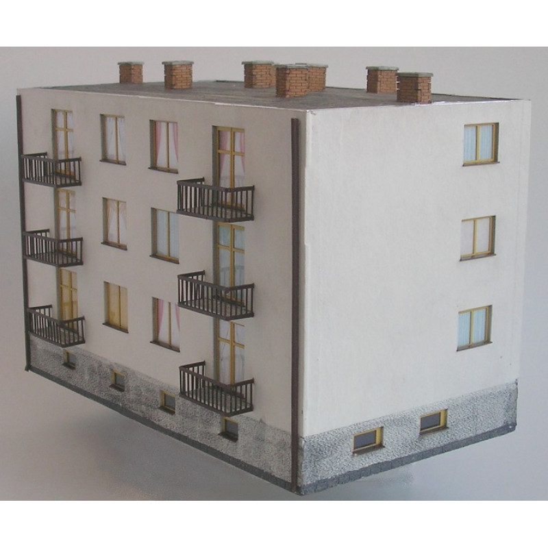 Přesná technologie laser cut je použita pro výrobu této stavebnice družstevního bytového domu. Jedná se o čtyřpodlažní bytový dům řadové družstevní výstavby, jaká probíhala v 70.-80. letech minulého století. Hodí se do okrajové městské čtvrti, může stát o samotě, ale i v řadové zástavbě. Zhusta byl stavěn i v zemědělských družstvech jako obydlí pro členy družstva. Lze jej vymodelovat jako nový, čerstvě obydlený, nebo chátrající, či v rekonstrukci s přistaveným lešením.