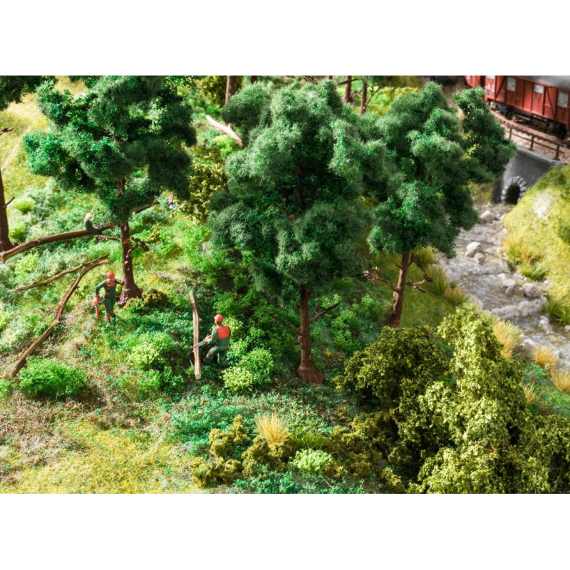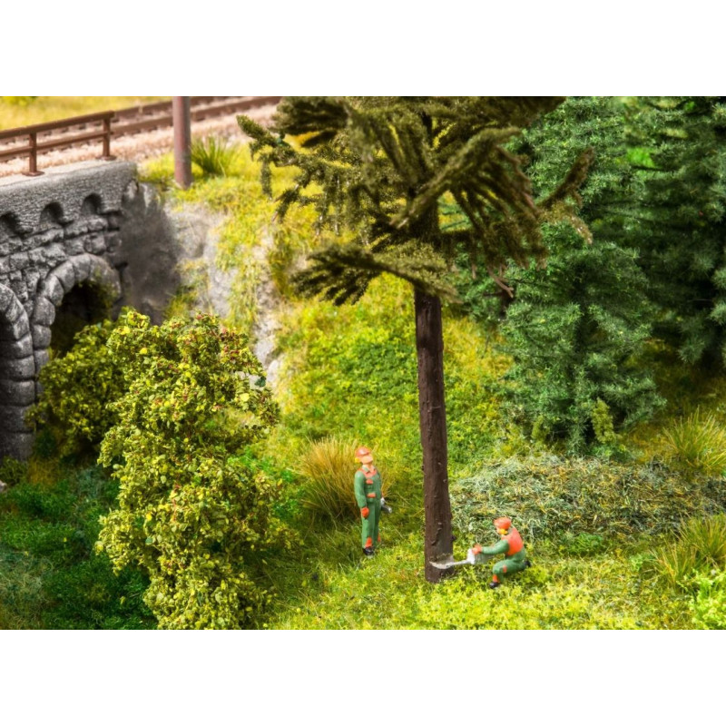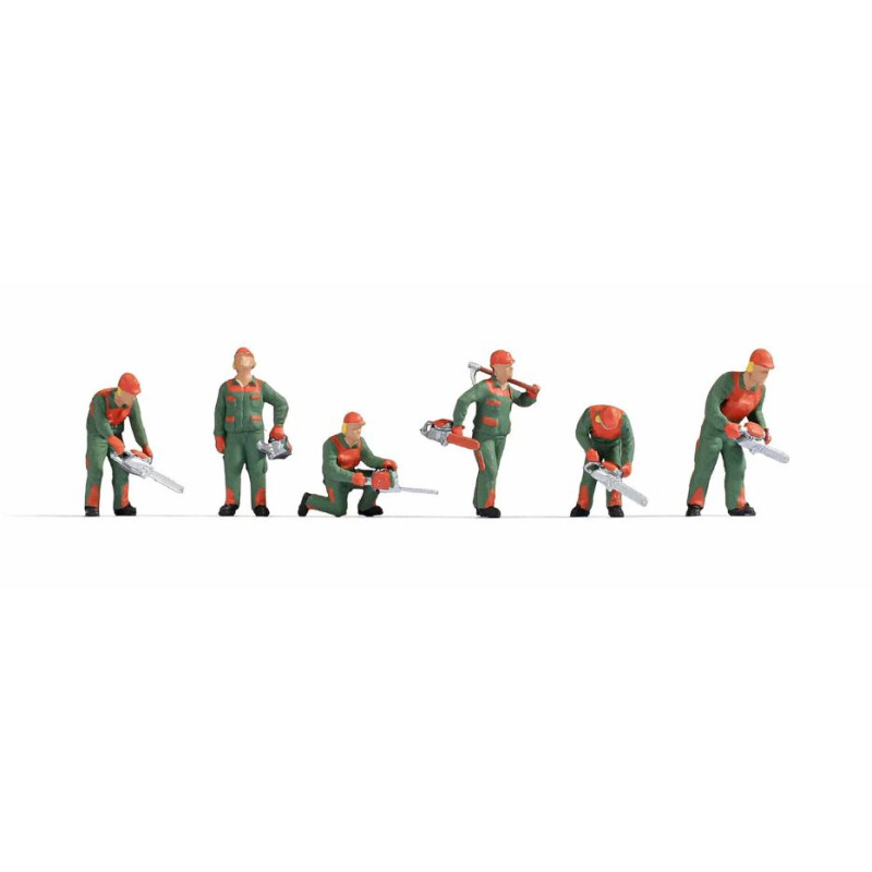 Scéna „kácení stromů“ poskytuje ještě více reality na vaší modelové krajině. S kalhotami, bundou, rukavicemi a helmou v barvách zelené a oranžové nosí postavy typický ochranný oděv lesních dělníků. Ani zde by samozřejmě neměla chybět motorová pila pro každého pracovníka. Navíc je slyšet zvuk motorové pily se startérem.