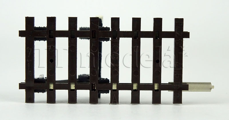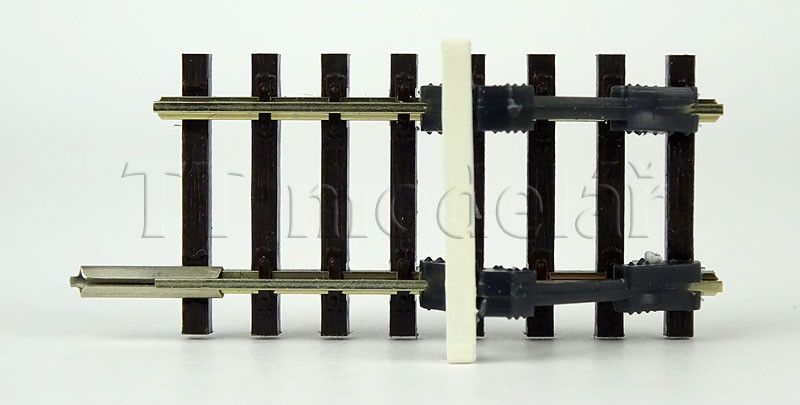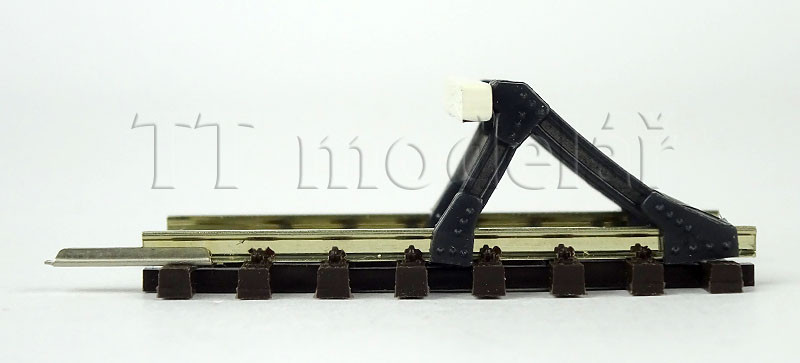 Rovná kolej o délce 41,5 mm na níž je připevněno zarážedlo s příčným pražcem.