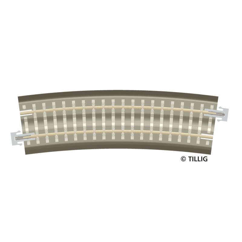 Oblouková kolej tzv. kolejiva s podložím - Bettungsgleis - poloměr 396 mm, výsek 15 stupňů, tj. pro půlkruh 6 ks. Vhodné pro časté rozpojování (stavba kolejiště na podlaze, stole). Na různé zkušební tratě v modelářských dílnách, do vitrín atd.