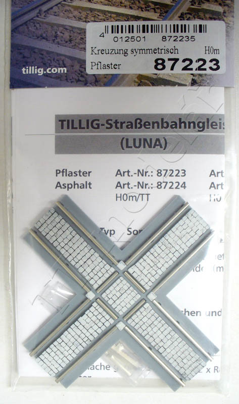 Pravoúhlá křižovatka s asfaltem/betonem, tramvajové kolejivo Luna, TT/H0m, Tillig 87224