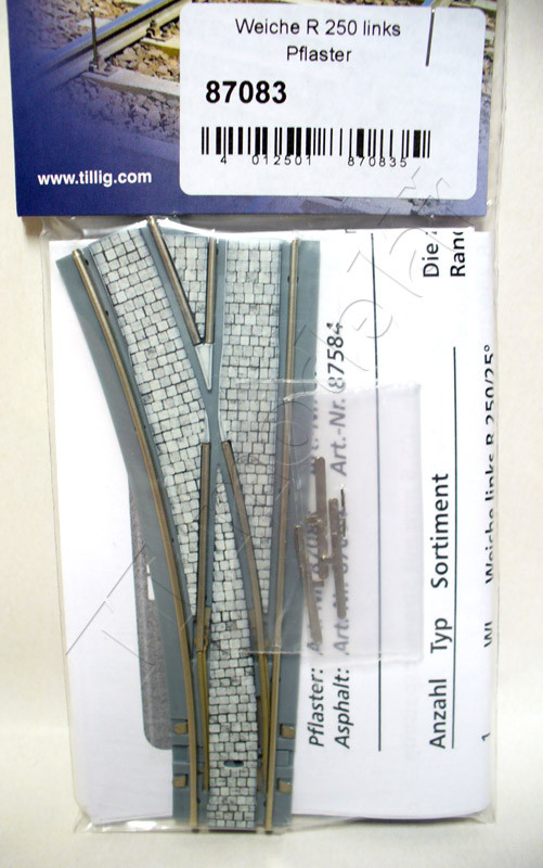 Výhybka jednoduchá pravá s dlažbou, R 250 mm, 25°, tramvajové kolejivo Luna, TT/H0m, Tillig 87088