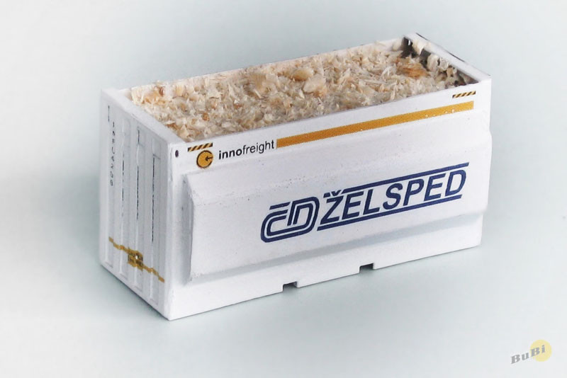 Hotový model kontejneru Innofreight s nápisem ,,ČD ŽELSPED" na štěpky. Vhodné pro vozy PIKO, Tillig, Roco.