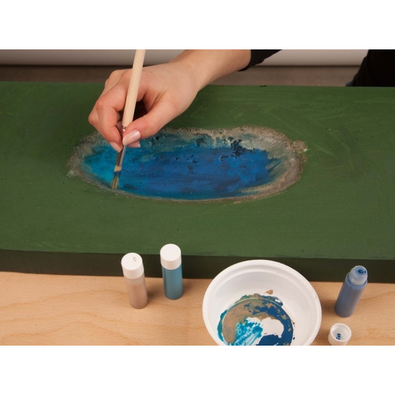Modelová voda XL je produkt vhodný pro projektování hladiny vody na rybnících, jezerech a potocích. Nalijte modelovou vodu do koryta ve vrstvě 2–3 mm. Doba schnutí je cca 24 hodin. Při vytvrzování ztrácí modelová voda přibližně 50 % objemu, což vede k poklesu hladiny vody o 1–1,5 mm. Důležité: Další vrstvy se nedoporučují, protože to může vést k zakalení nejnižší vrstvy vody!