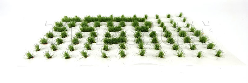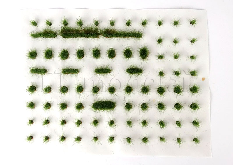 Drny se sejmou z nosné folie a přilepí. Výška stébel: 6 mm. 78 ks travních drnů různé velikosti a tvaru.