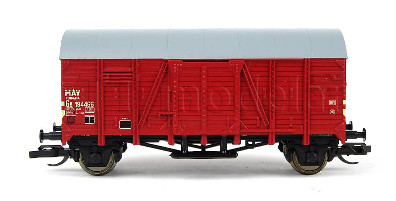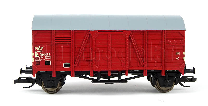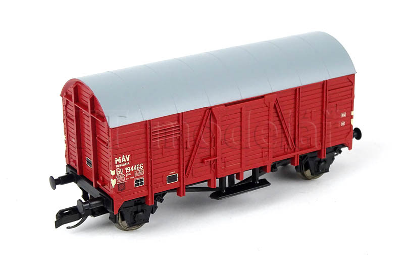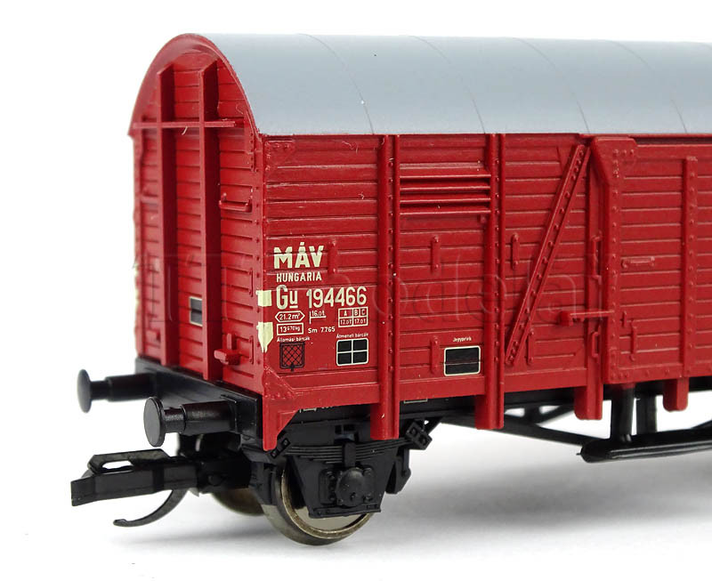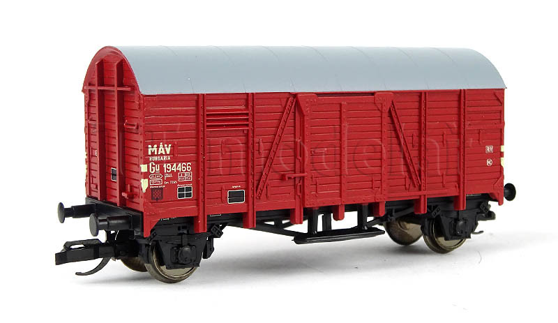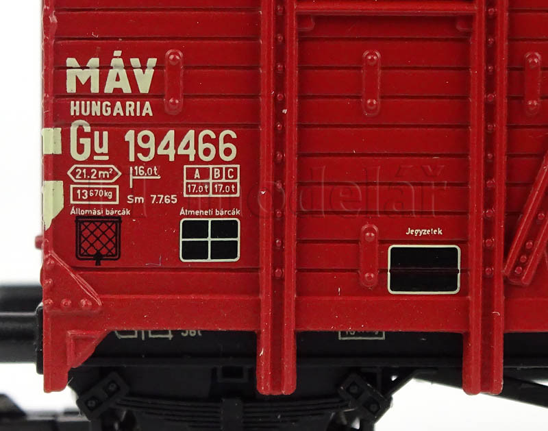 Model krytého nákladního vozu bývalé výrobní řady Oppeln, zařazeného u MÁV jako řada Gu. Kinematiky krátkého spřáhla se šachtami dle NEM 358, kvalitní dvojkolí, popis rámu, rohové označení brzdy, schránka na vozové nálepky atd.