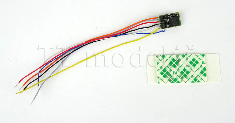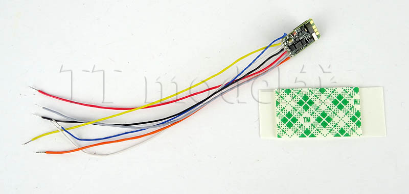 Lokomotivní dekodér SILVERmini+ pro velikost N a TT. Připojení do lokomotivy se provádí pomocí zástrčky do zásuvky dle NEM 651, která bývá použita v téměř všech lokomotivách TT (6 pinů v řadě).