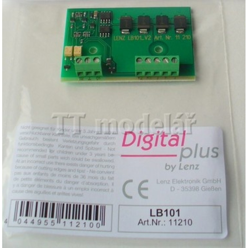Modul určený pro zjištění obsazení kolejí. Pomocí jednoho snímače LB101 lze hlídat dva nezávislé úseky. Pracuje na principu detekce protékajícího proudu mezi kolejnicemi, detekuje tedy lokomotivy a nebo vozy s kovovými dvojkolími opatřenými odporovým lakem. Z tohoto modulu se signál vede do kodéru LR 101 (pro 4 takovéto moduly - 8 úseků), který informace dále zakóduje a předá do sběrnice zpětného hlášení RS.