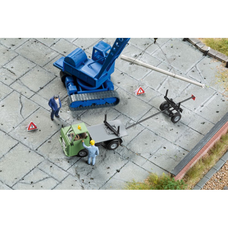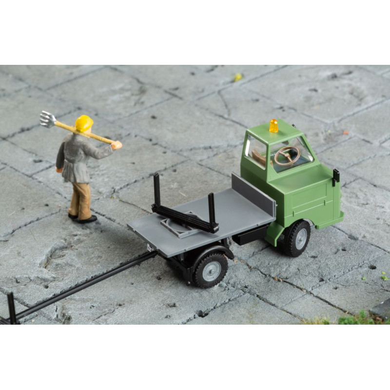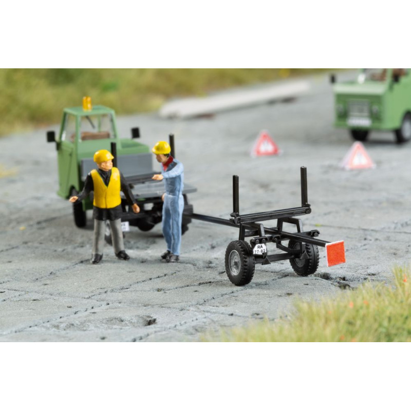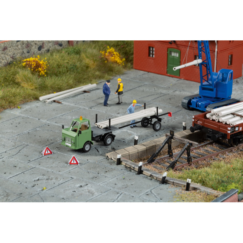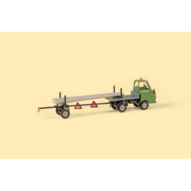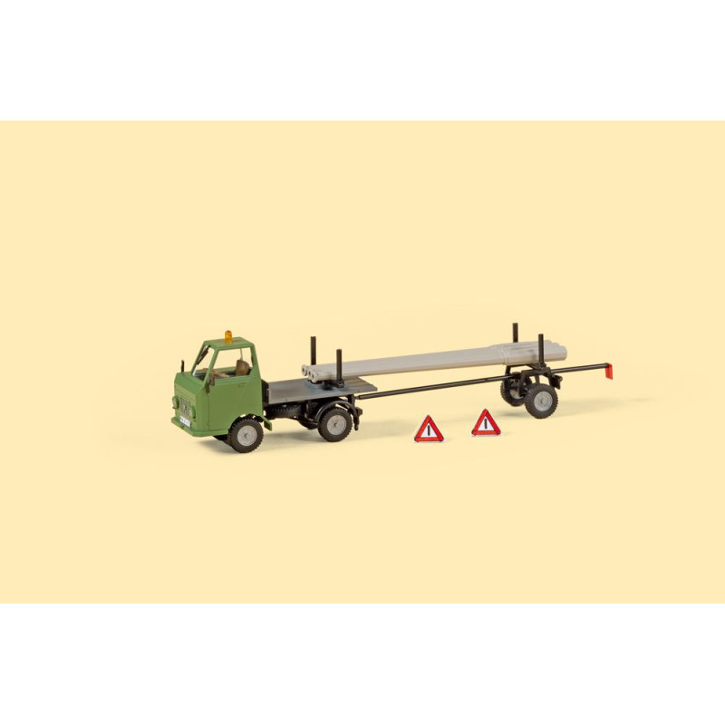 Tažený přívěs je ideální pro bezpečnou přepravu dlouhého zboží, v tomto případě přiložených stožárů z předpjatého betonu. Zde náklad spočívá jak na točně známého modelu Multicar M22, tak mezi klanicemi návěsu spojeného s nastavitelnou ojí.