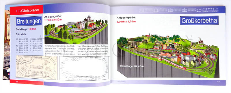 Plánky kolejišť TT s použitím modelového kolejiva a kolejiva s podložím. Včetně výpisů kolejiva.
