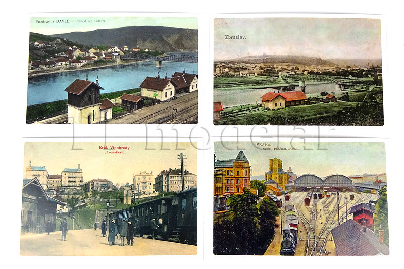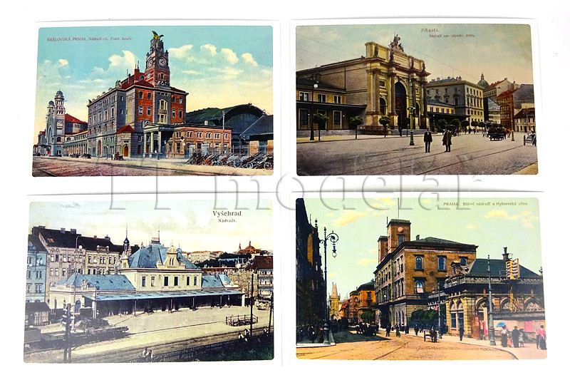 Sada pohlednic s vyobrazením starých pražských nádraží, v některých případech dnes už neexistujících, jako například Praha-Těšnov. Pokochat se můžete i podobou, jakou měla některá nádraží před tím, než je zub času – a hlavně lidé, zdevastovali – například Praha-Vyšehrad. Na zadní straně každé pohlednice je podrobný popis.