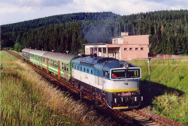 Pohlednice, motorová okomotiva 750.182 v zastávce H.Štubňa - červenec 2001, Corona CPV029