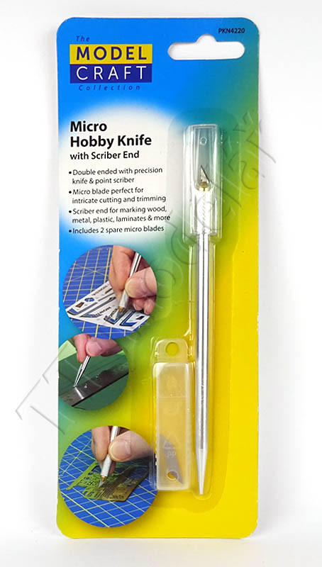 Mikroskalpel se dvěma náhradními špičatými přímými čepelemi, druhý konec nástroje upraven jako tupé rydlo.