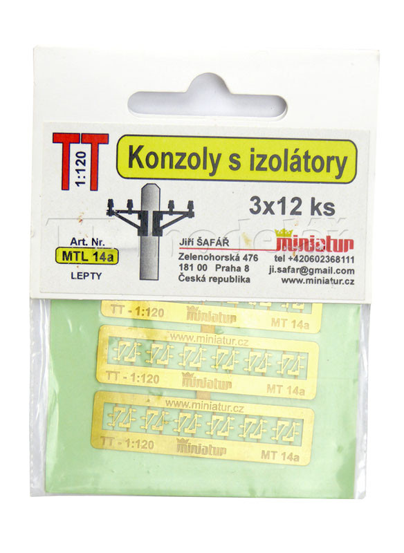 Sada 3 kusů leptů 2-izolátorových konzol na telegrafní sloupy. Toto dvou vičové vedení bylo určeno pro traťový telefon. Lze využít k doplnění dalších vedení (u větších stanic, kde se sbíhaly tratě ) či k umístění na budovy.