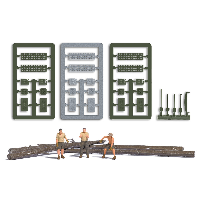 Se 4 kmeny stromů, nářadím a 6 kanystry, boxy na nářadí a zásobníky na písek.