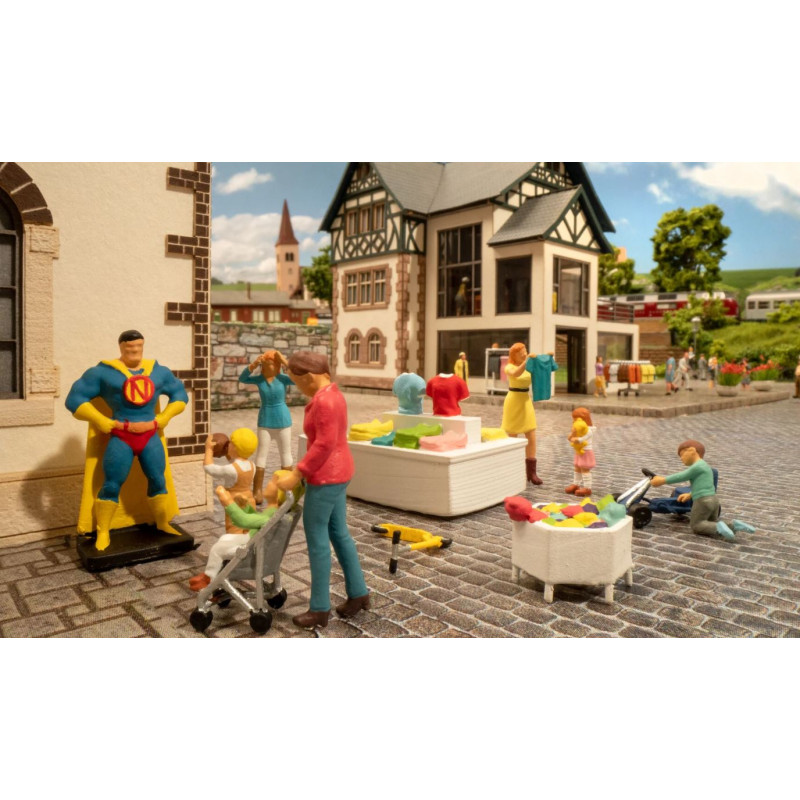 2 maminky s kočárkem a dítětem, 3 hrající si děti, velká dekorativní figurka "Superman", skútr a šlapací autíčko, 3 produktové prezentace s míčky, hračky a oblečení.
