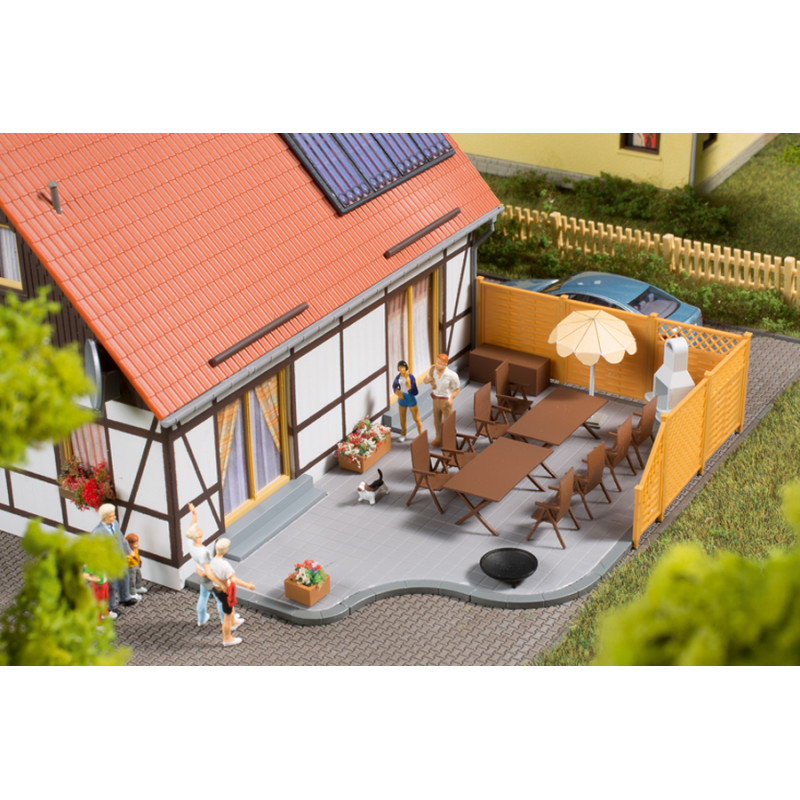 Stoly, polohovací lehátka, slunečníky, čalouněné boxy, krb...