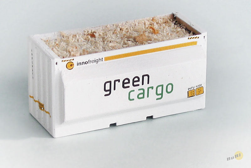 Hotový 3D model kontejneru Innofreight s nápisem ,,Green Cargo" (Švédsko) na štěpky.