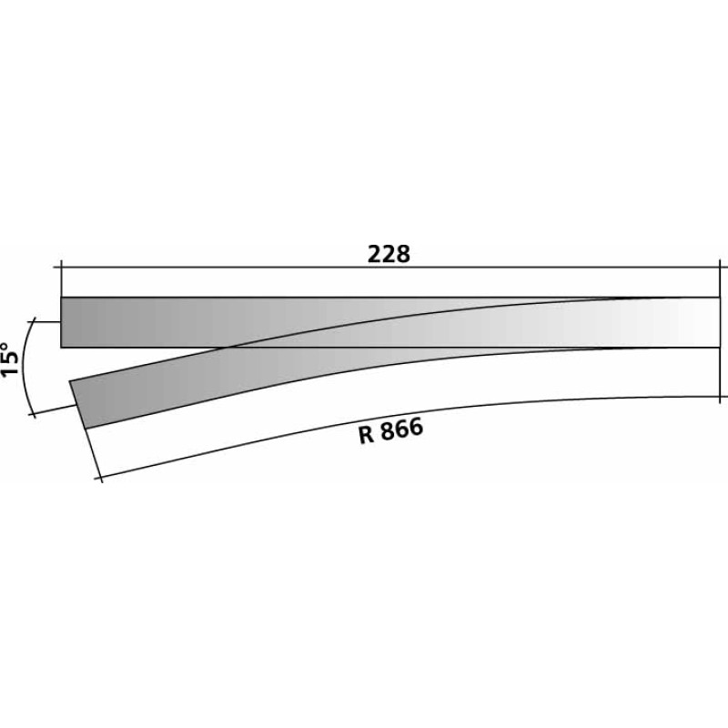 Jednoduchá výhybka pravá, úhel srdcovky 11°, úhel odbočení 15°, R 866 mm, d0lka 228 mm.