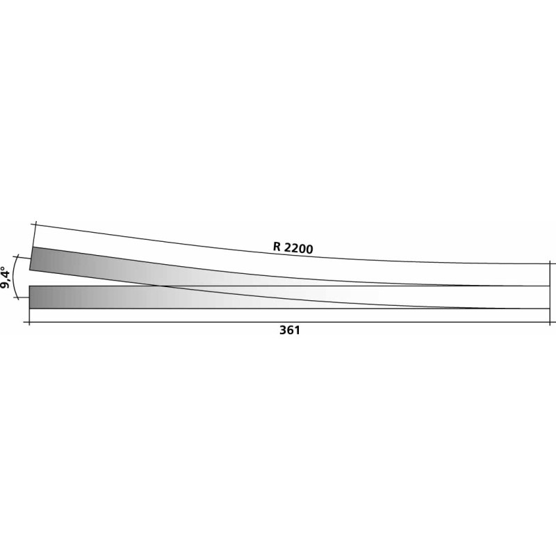 Štíhlá výhybka pravá, úhel srdcovky 7°, úhel odbočení 9,4°, R 2.200 mm, délka 361 mm.