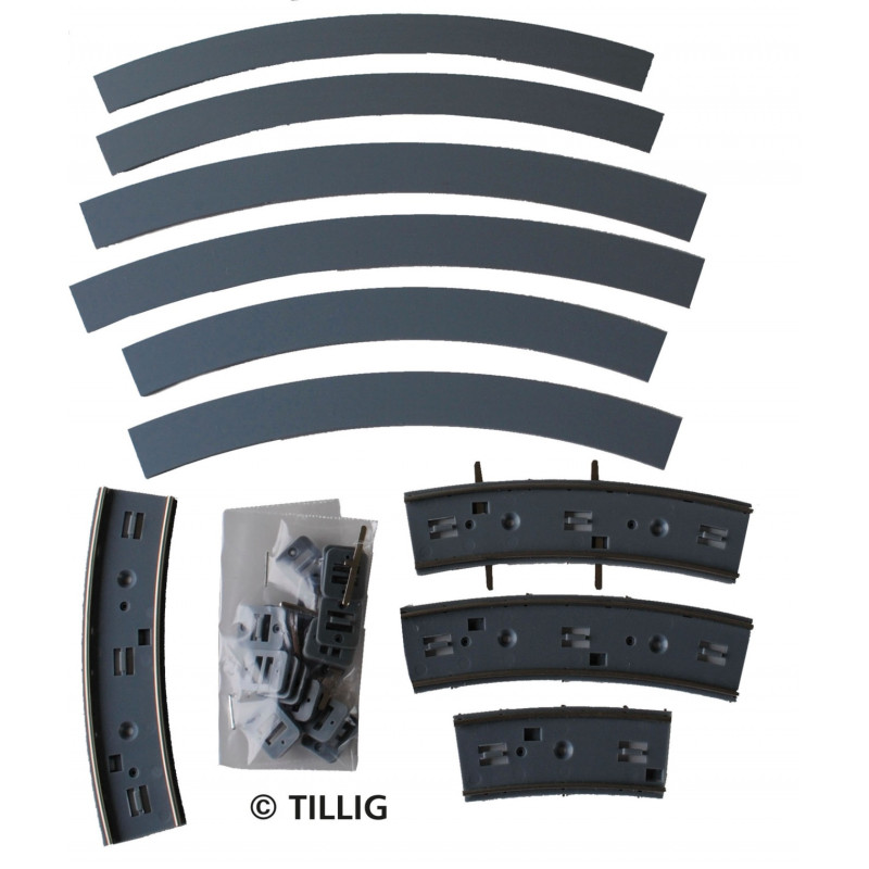 Povrch komunikace s asfaltem/betonem, oblouk, R 204 mm, 45°, 3 kusy, tramvajové kolejivo Luna, H0, Tillig 87867
