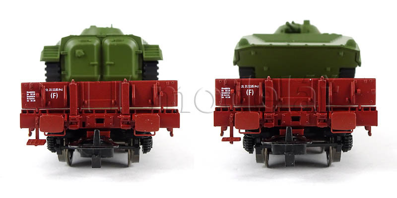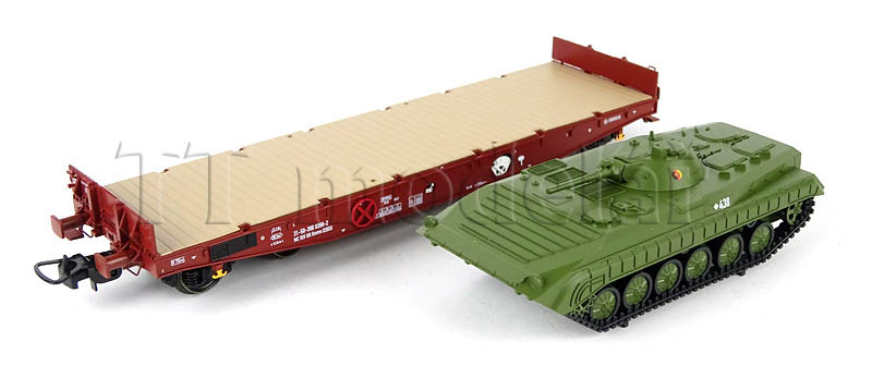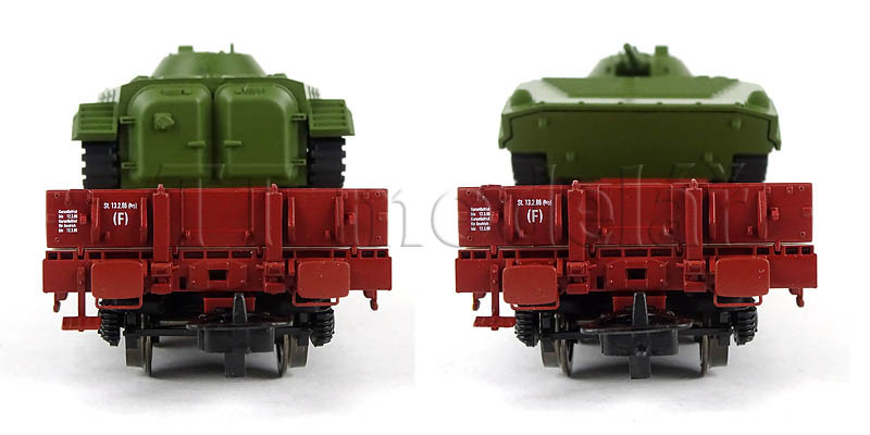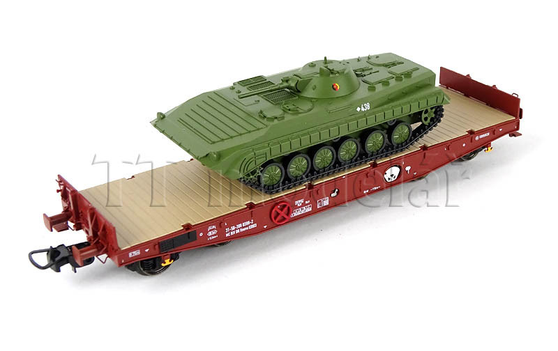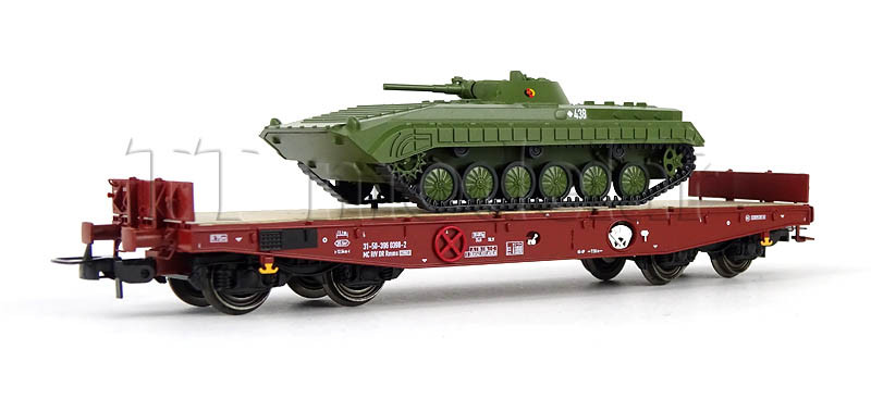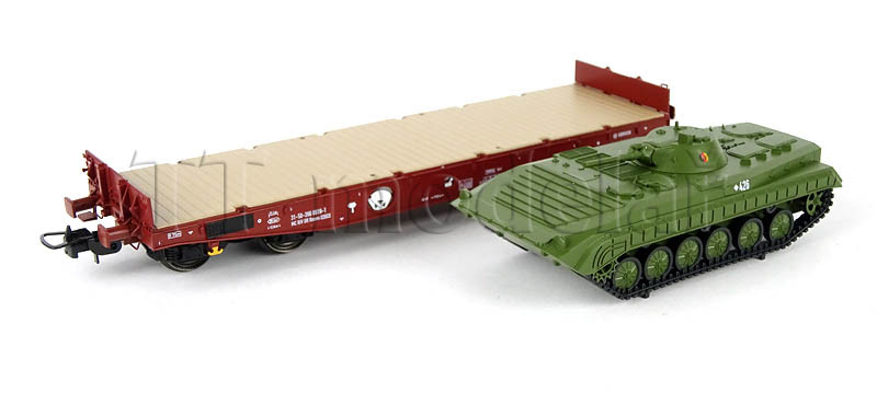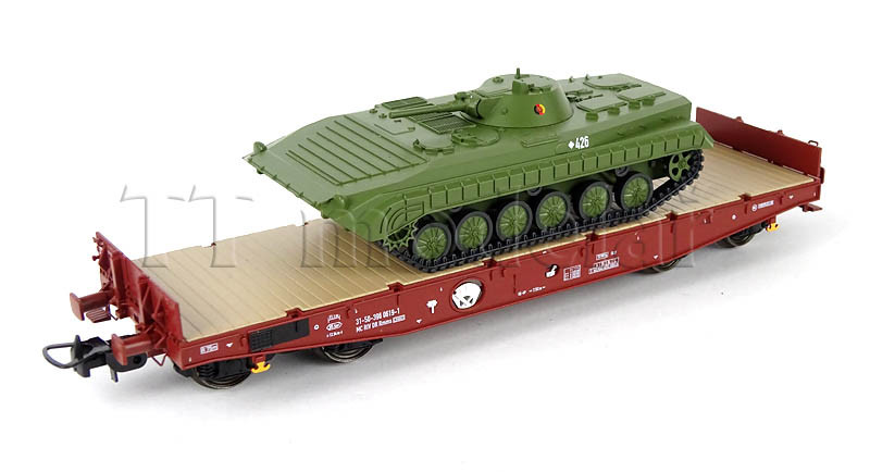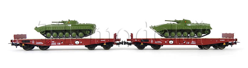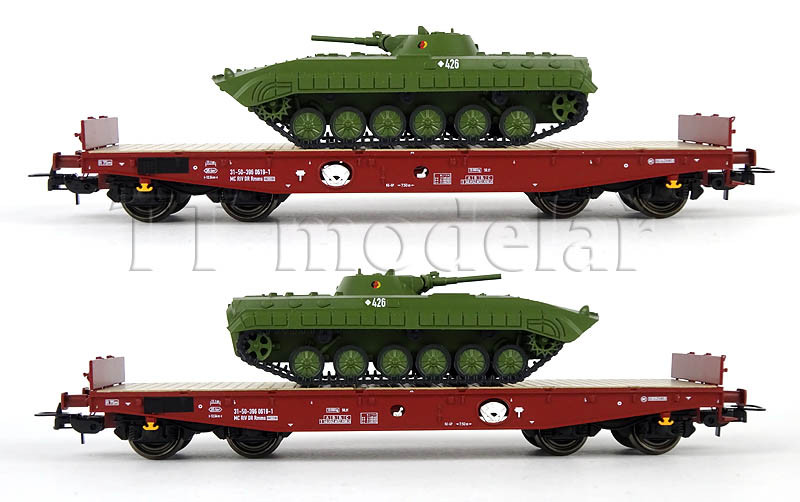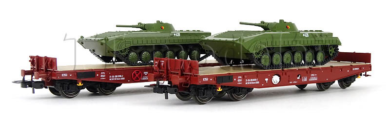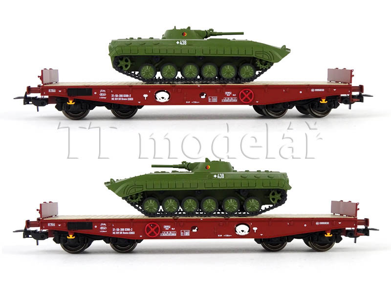 Set dvou plošinových vozů Rmms 3960 naložených tanky typu BMP-1 ,,NVA”, DR, IV. epocha, H0, Tillig 70058