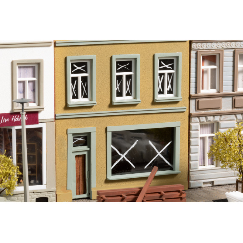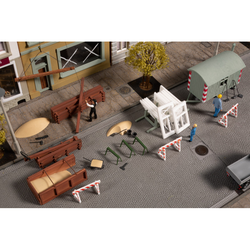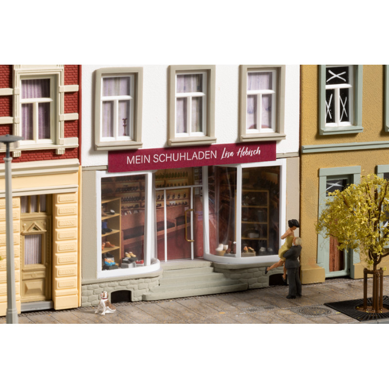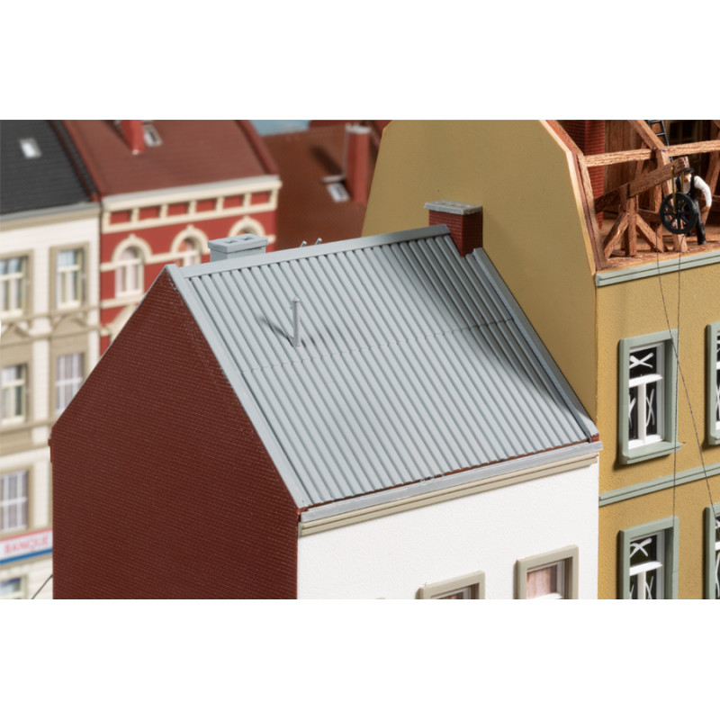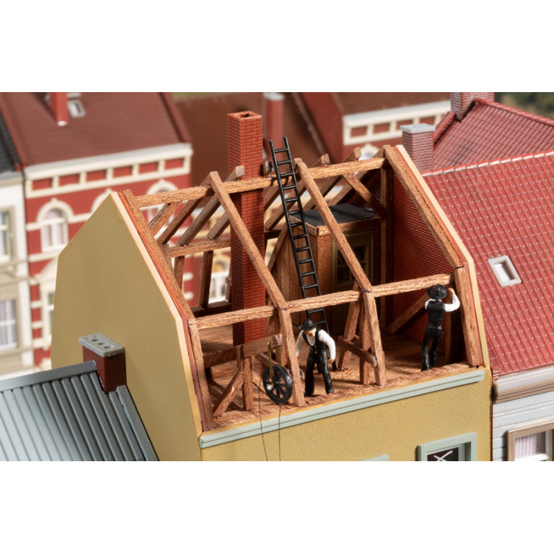 Městské domy na Schmidtstrasse jsou již léta na mnoha modelech železnice. Ulice se opět prodlužuje. Na návrh účastníka semináře Auhagen byl postaven dům s obchodem s obuví. Poutavý je zejména interiér obchodu a design vchodu se zakřivenými výlohami. Šedá střecha vede ke změně na Schmidtstrasse. Druhá budova je v současné době v rekonstrukci. Pro jistotu jsou okenní tabule natřeny bílými křížky na znamení, že jsou v nich skleněné tabule! Tesaři pracují na střešní konstrukci. Materiál je přepravován nahoru tahem za lano přes kladku. Sada obsahuje mnoho stavebního náčiní: hromady dřeva, podstavce, okna, nářadí všeho druhu a štěrkový žlab ze silných dřevěných prken. Varovné rohy jsou vytištěny na modelu stavebního přívěsu.