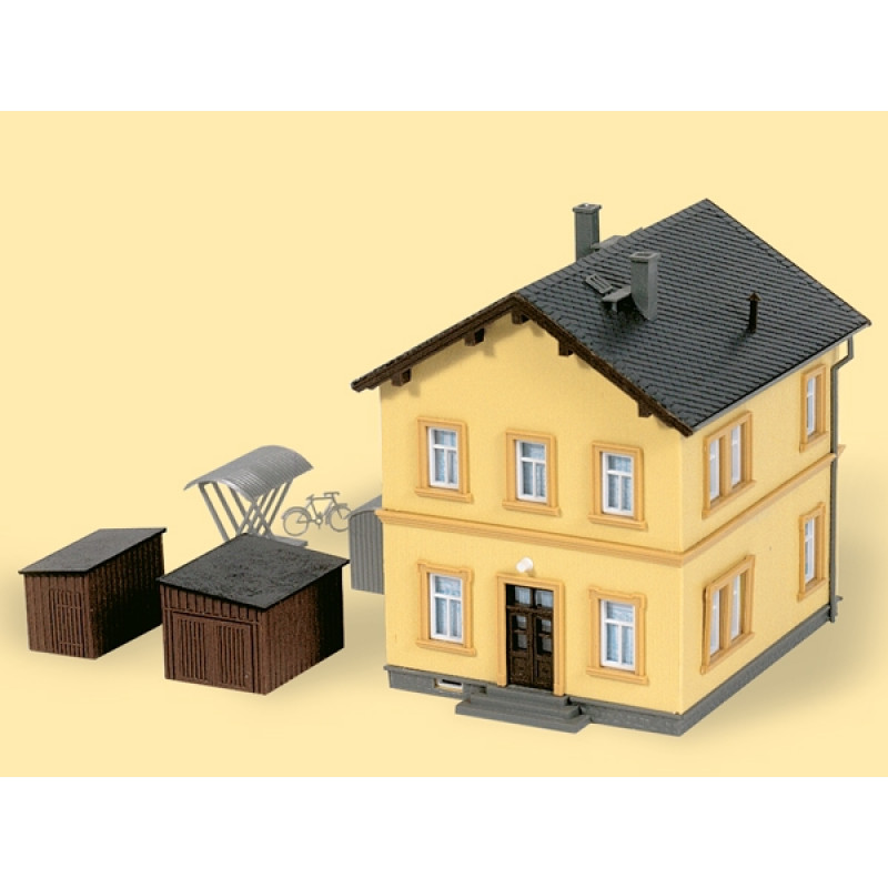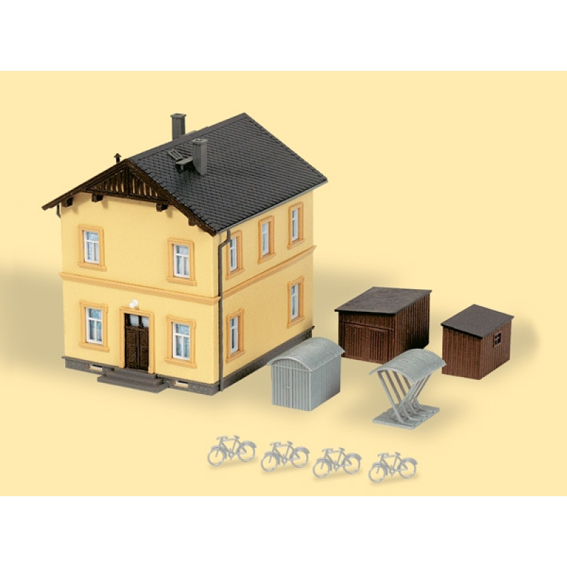 Služební a obytná budpva. Předlohou modelu je dům z roku 1900. Kůlny a stojan na kola jsou součástí stavebnice.