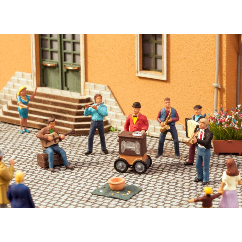 Pouliční muzikanti vnesou do vašeho modelu železnice ještě více reality a rozhodně upoutají pozornost. Sada obsahuje šest hudebníků. Muž v černém klobouku a červené bundě hraje na sudové varhany, muž v modrých džínách, černém saku a červené kravatě hraje na trubku a další muž v červených kalhotách a šedém svetru hraje na harmoniku. Kytarista nosí modré džíny spolu se zelenou košilí a hnědou bundou. Obsahuje také hráče na flétnu s modrou košilí a šedými kalhotami a saxofonistu s modrou vestou a červenou košilí. Navíc zní typický sudový varhanní kus.