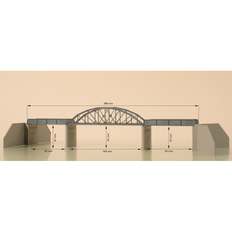Ocelový jednokolejný most pro přímou kolej. Možno prodloužit další stavebnící. Poloha opěrných zdí je volitelná. Celková délka 398 mm. Rozměry k dispozici na poslední fotografii.