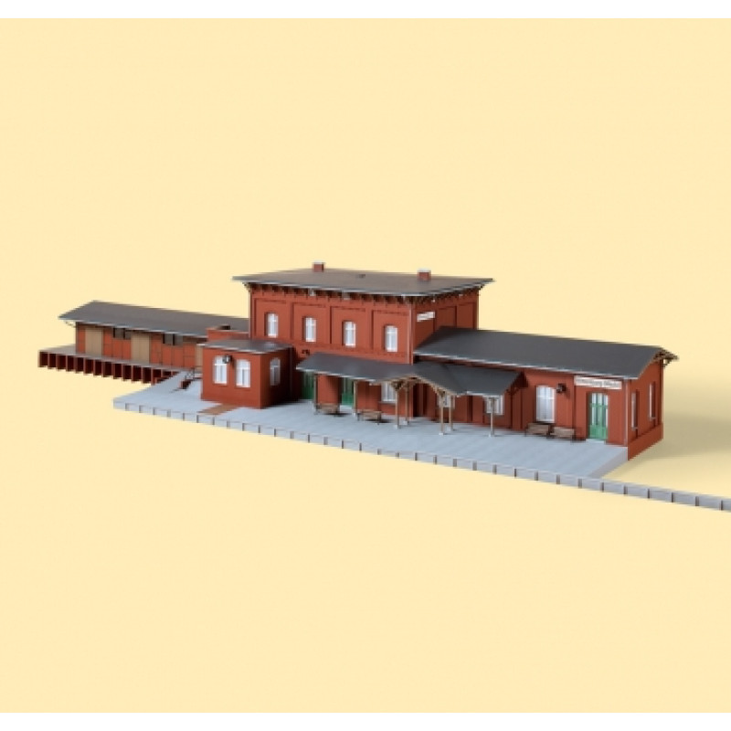 Předloha tohoto modelu je v blízkosti Schwerinu na trati Hagenow - Zarrentin. Také v Šlesvicku-Holštýnsku lze najít podobné staniční budovy. Díky čtvercovému centrálního bloku s netradičním tvarem střechy je stavba velmi atraktivní. Skladiště, nástupiště, zastřešení, malá rampa, hodiny, lampy a lavičky. Filigránské zábradlí je řezané laserem z pevného barevného kartonu. Při použití kolejí s podložím je nutno upravit výšku základny. Vzdálenosti hrany nákladní rampy je 78 mm od nástupiště. Rozměry: 500 x 170 x 96 mm.