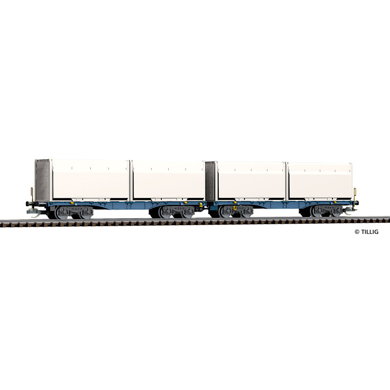 Dvojdílná vozová jednotka InnoWaggon 2x40ft, ložená čtyřmi kontejnery na dřevo, VI. epocha, TT, Tillig 15080