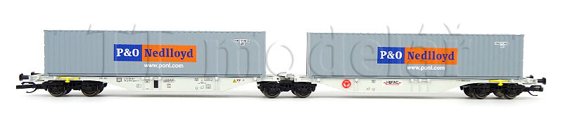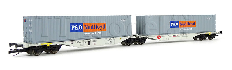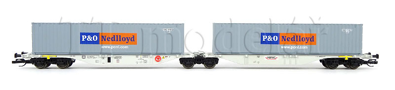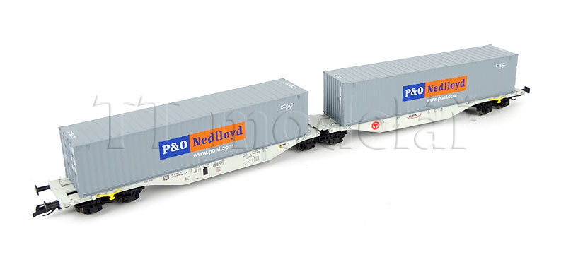 Kontejnerový vůz Sggmrs, Rail Re Lease B.V., ložený dvěma kontejnery, VI. epocha, Tillig 18066