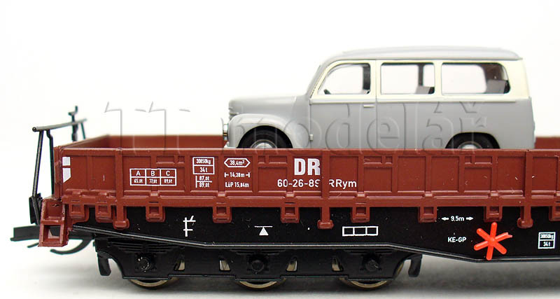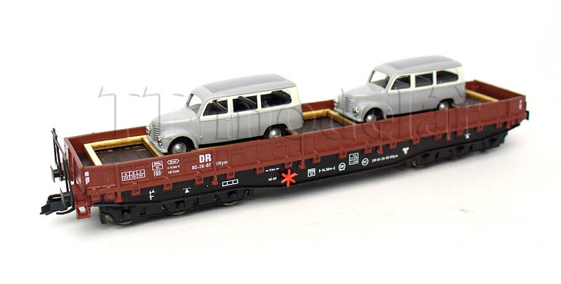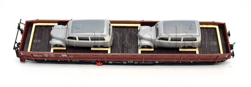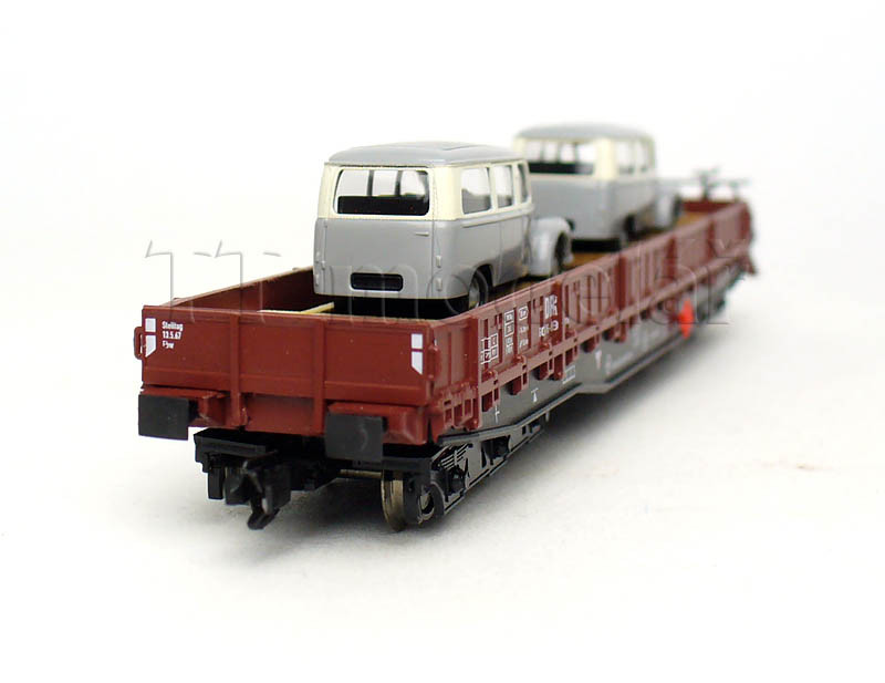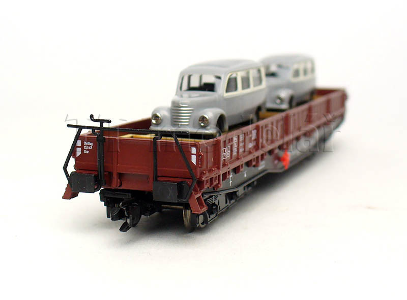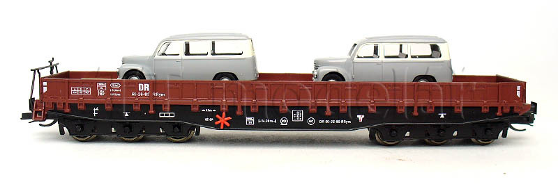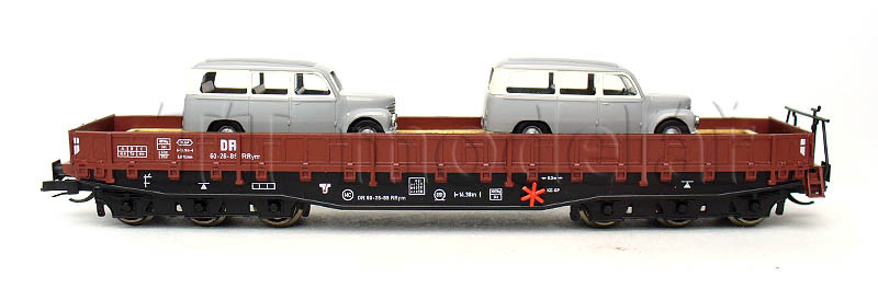 Nízkostěnný vůz Samm 4818 se dvěma automobily, DR, III. epocha, TT, Busch 31173