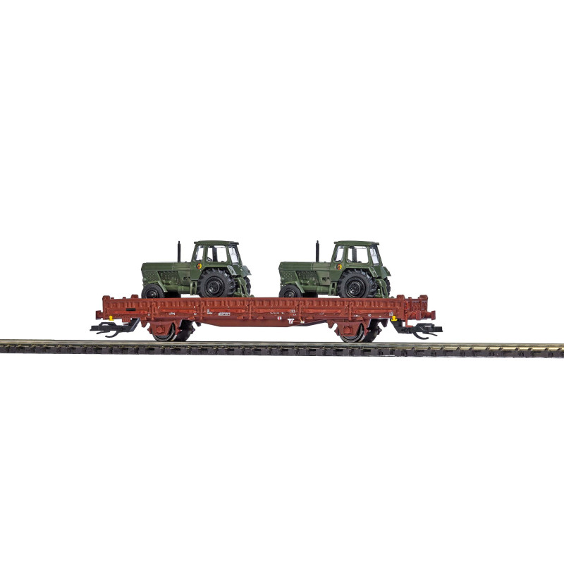 Plošinový vůz řady Ks s klanicemi, DR, ložený dvěma traktory ZT 300 NVA, IV. epocha, TT, Busch 31510
