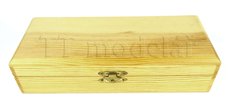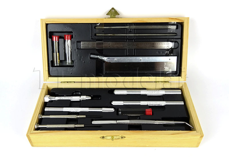 Sada nářadí pro železniční modeláře - dřevěná kazeta obsahuje dva skalpely, náhradní čepele, ruční vrtačku s vrtáky, šroubováky, 2 pilníky s rukojetí atd.